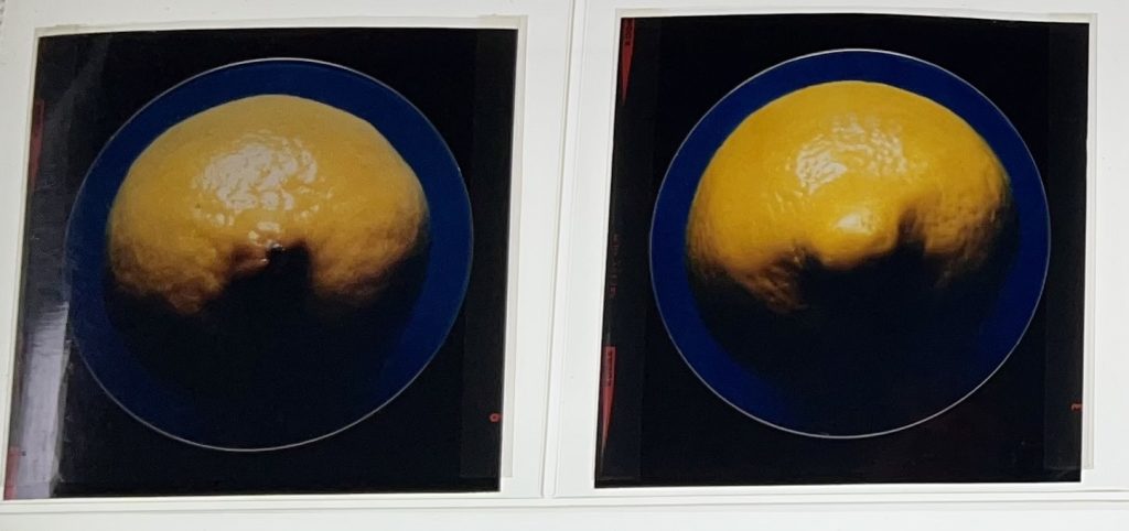 There were photographs of the tip of a pencil, a Yale cylinder lock, an old onion—and the same onion photographed two weeks later. Then there were flowers, with stamens and petals spreading out, a fern unfolding, and fruit, including lemons, apples and pears. A quasi-scientific impulse clearly lay behind Flowers’ choice of subject matter, overlaid with a sense of the surreal. His images evoke the world as seen through a microscope—in this case, the ‘microscope’ being a medium format Hasselblad, and larger format 5×4 camera, with the objects ranging from natural to man-made. Flowers was interested in the real, and the fake: a photograph of a false lemon was set alongside a real lemon. The multiplication of these images, ‘skied’ within the gallery space at Portland Mews, created a hypnotic atmosphere.