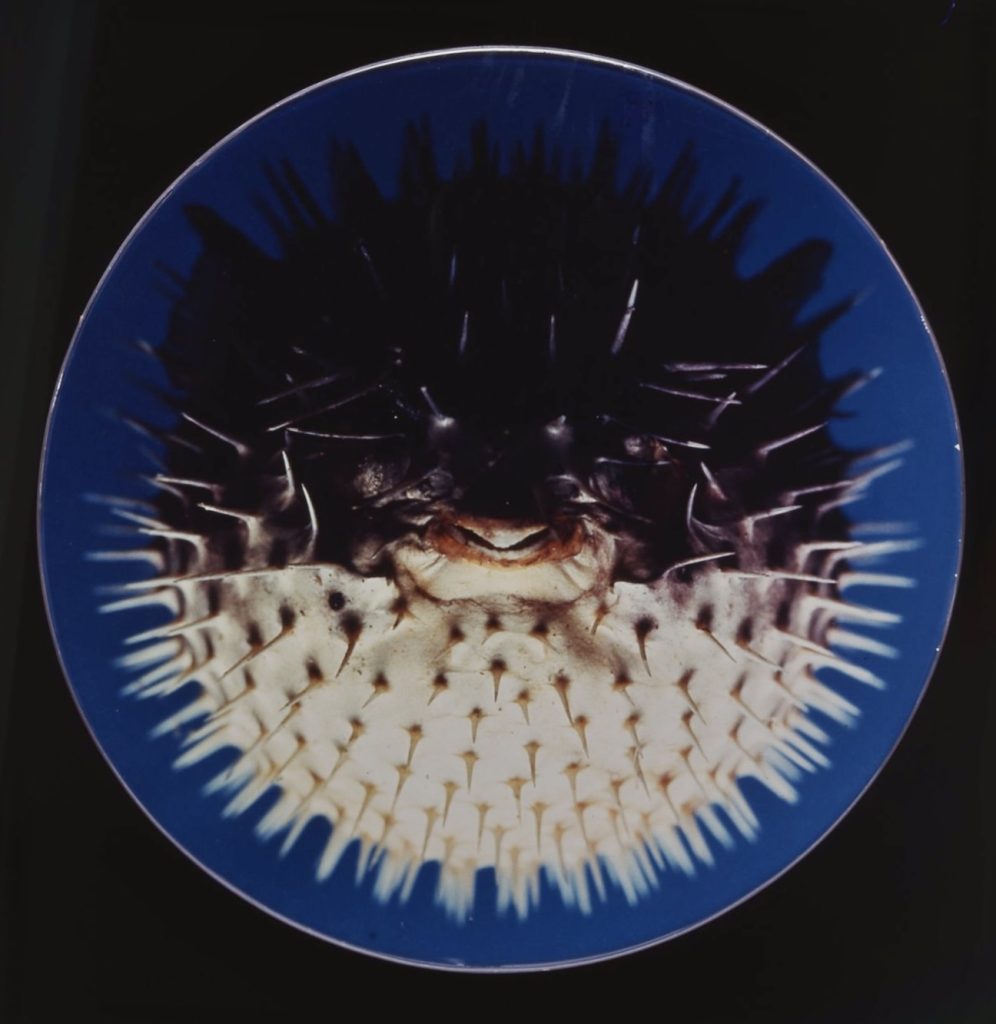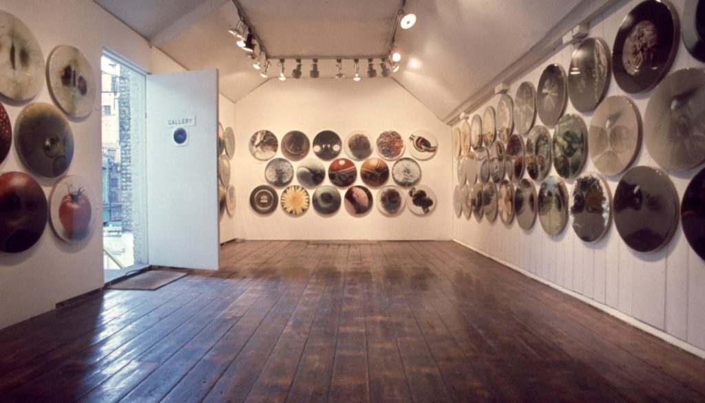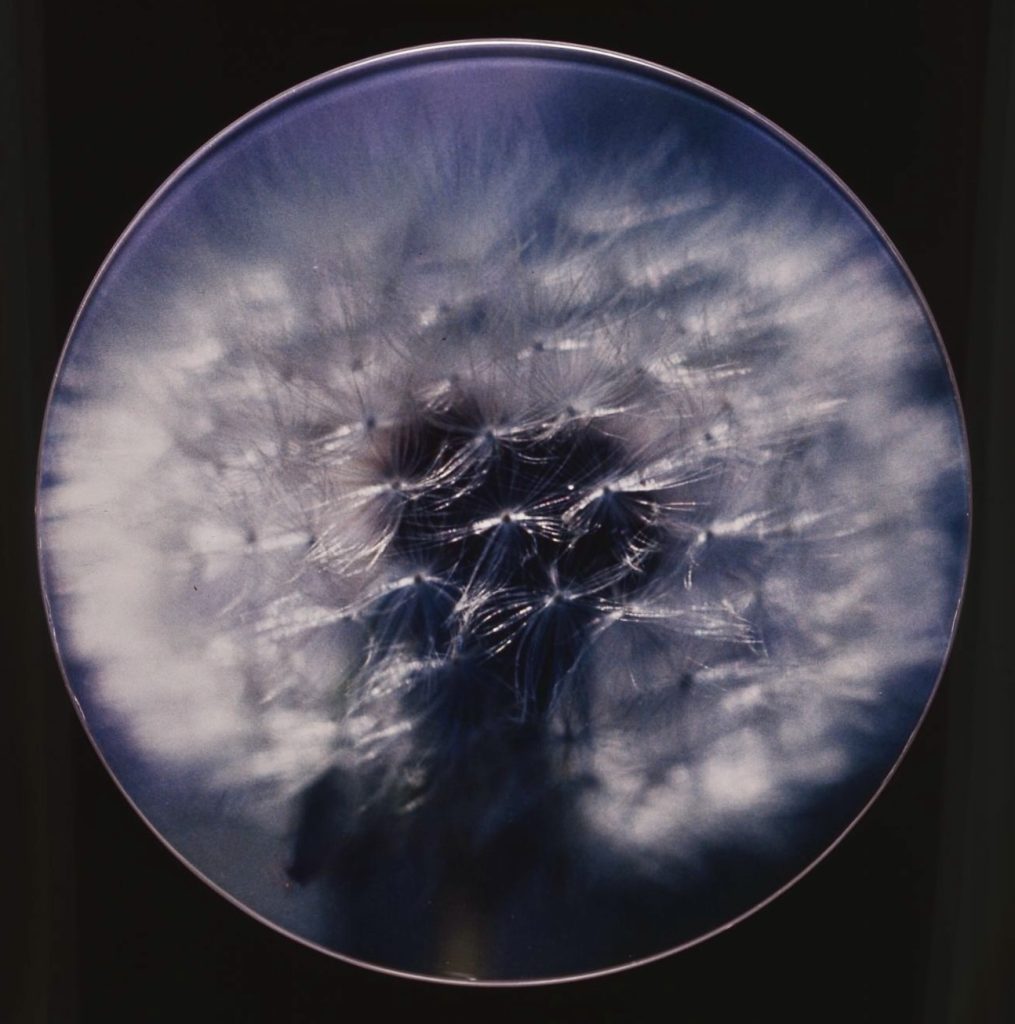 A circular tray of rubber bands, a cricket ball, the spoked wheel of an Aston Martin, a dandelion puffball—these are just a few of the images in the collection of photographs taken by Adrian Flowers and shown in July 1972 at the Angela Flowers Gallery in Portland Mews. The exhibition was titled “One Hundred Pictures In the Round” with each photograph being a circular colour print, 53 centimetres in diameter, encased within a tray frame made of clear Perspex. Although the subject matter was often everyday and down-to-earth, there were no images of plain cups, saucers, plates, or clock faces. Every object had been chosen for its eye-catching qualities, and ability to intrigue and surprise, often with a little shock of recognition. The subjects included a knotted cable, ball of twine and an inflated puffer fish.