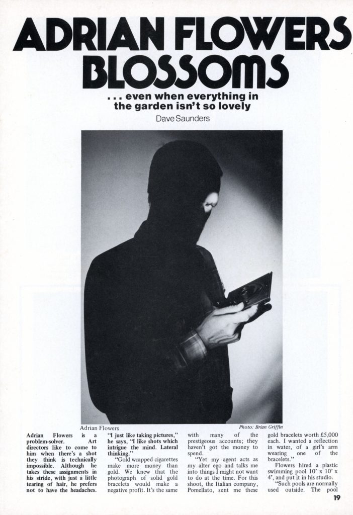 When Selkirk realised that getting a visa to work in the US was not going to be straightforward, he sought employment in London, and was taken on by Adrian Flowers, [on 9 September 1968] at his studio in Tite Street. In a recent interview with Elizabeth Avedon (former daughter-in-law of Richard) Selkirk recalled his time there; affirming how Flowers was ‘a big name’ in the London photography scene from the 1950’s through to the early 90’s. Flowers’ studio was ‘the place to be photographed’ for advertising and editorials, and for actors, celebrities and artists.