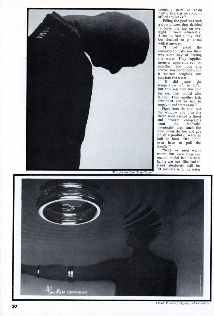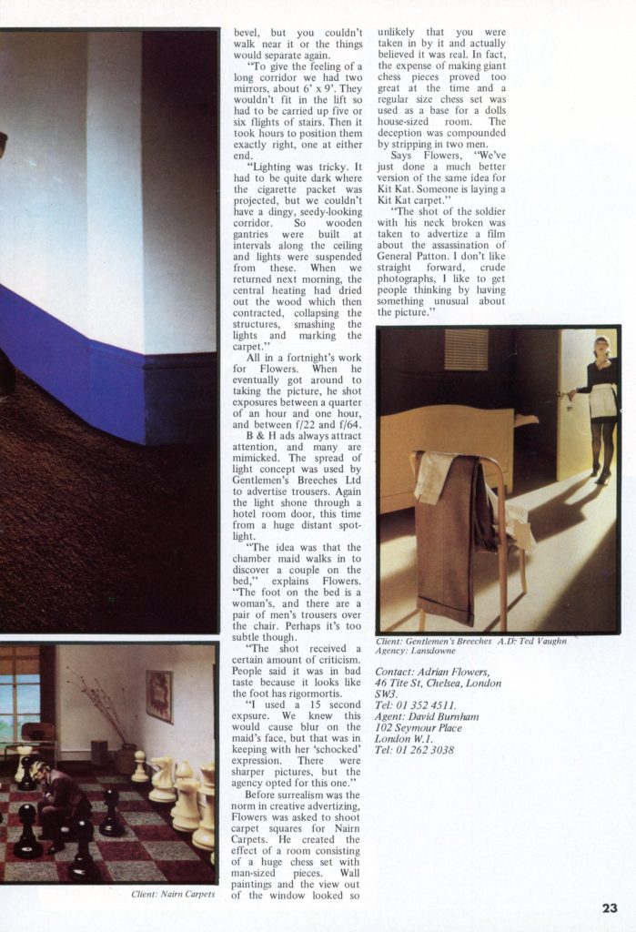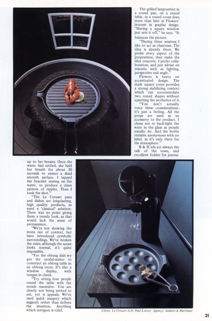 Flowers photographed Birds Eye products (for Carol Nelson, Ray Gundersen and Arthur ‘Art’ Parsons at CDP), and National Panasonic televisions. Art Parsons and Richard Dearing directed a series of Post Office ad campaigns, with photography by Flowers, who also worked on campaigns for Olympus cameras.