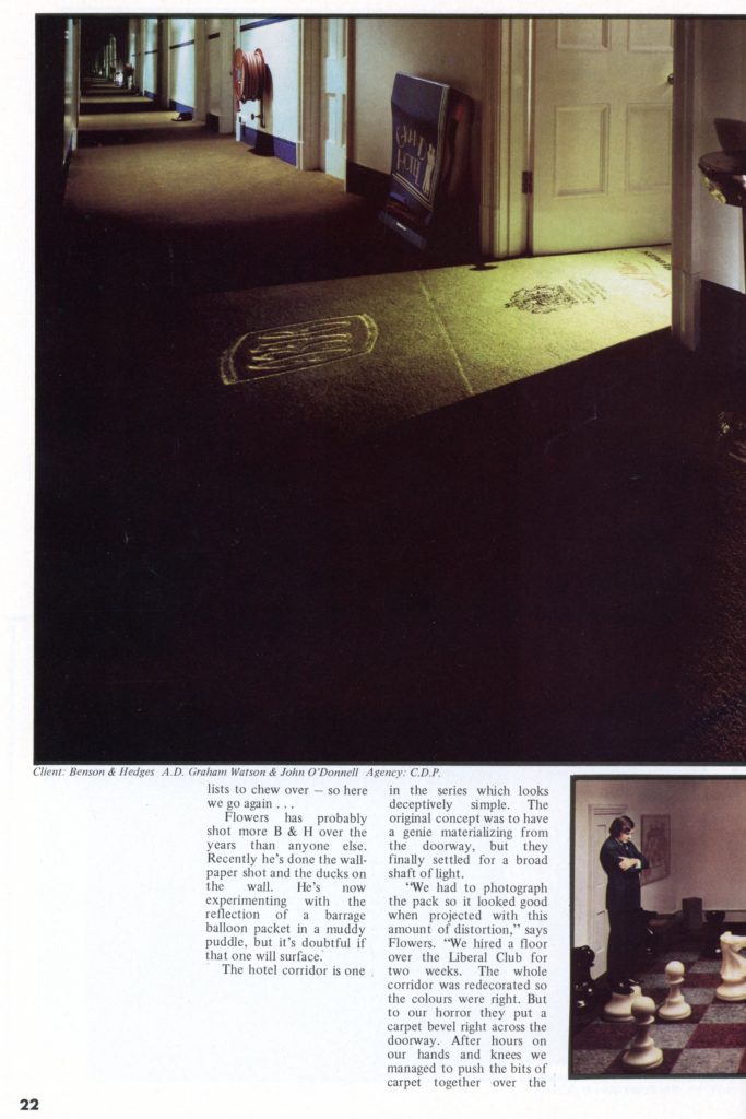 In retrospect not all of the agency’s work was ethical. Frozen peas were one thing, but CDP campaigns enabled the tobacco giant Gallaher to double sales of its cigarettes, at a time when the dangers of smoking were becoming public knowledge. With cigarette advertising progressively restricted, initially from television, then print media, CDP created campaigns for Gallaher that were subtle, allusive and often surreal. Even if it was not identified, consumers understood the product being advertised: Hamlet, Benson & Hedges and Silk Cut. Dead-pan and humorous, the Hamlet ads played on peoples’ responses to stressful situations. There was a hidden sub-text, this stress being associated with increasing affluence and social change. Devised by Alan Waldie and Mike Cozens, the Benson & Hedges campaigns were legendary. Adrian Flowers worked on many of these, devising and photographing elaborate sets. Although illogical and irrational, the ads doubled the sales of Benson & Hedges, and in 1978 Waldie was awarded the D&AD Gold Award. Flowers’ photographic shoots included a brightly-lit doorway in a hotel corridor, a cigarette pack standing amidst Stonehenge orthostats, a jig-saw puzzle, and a box containing cufflinks, ornate lighter and a cigarette pack, labelled ‘props for Elyot Chase in Private Lives’.